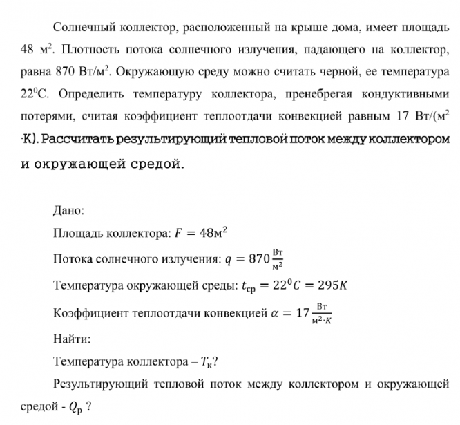 Солнечный коллектор, расположенный на крыше дома, имеет площадь 48 м2. Плотность потока солнечного излучения, падающего на коллектор, равна 870 Вт/м2. Окружающую среду можно считать черной, ее температура 220С. Определить температуру коллектора, пренебрегая кондуктивными потерями, считая коэффициент теплоотдачи конвекцией равным 17 Вт/(м2 ∙К). Рассчитать результирующий тепловой поток между коллектором и окружающей средой.