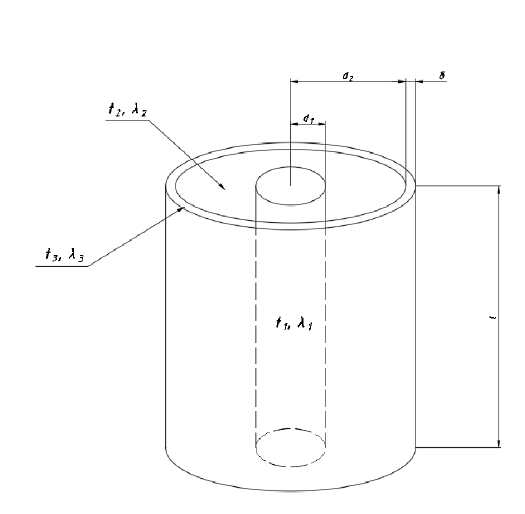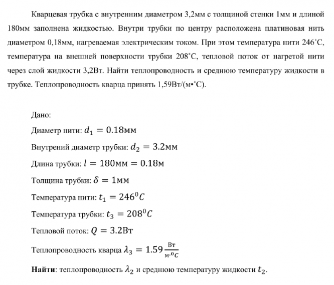 Кварцевая трубка с внутренним диаметром 3,2мм с толщиной стенки 1мм и длиной 180мм заполнена жидкостью. Внутри трубки по центру расположена платиновая нить диаметром 0,18мм, нагреваемая электрическим током. При этом температура нити 246˚С, температура на внешней поверхности трубки 208˚С, тепловой поток от нагретой нити через слой жидкости 3,2Вт. Найти теплопроводность и среднюю температуру жидкости в трубке. Теплопроводность кварца принять 1,59Вт/(м•˚С).