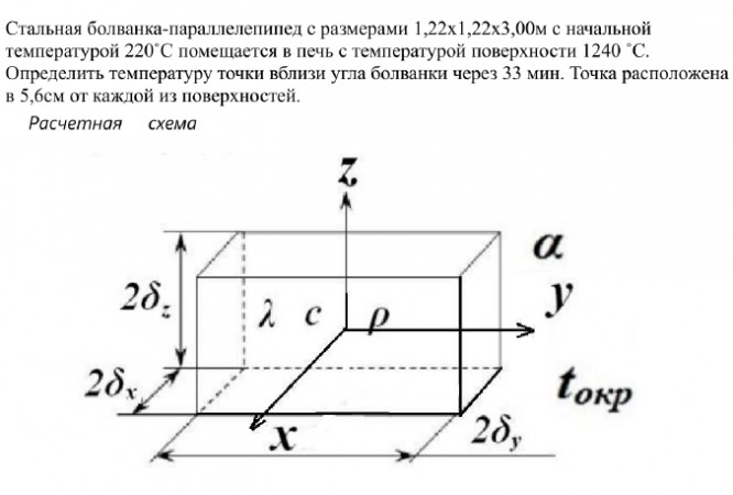 Стальная болванка-параллелепипед с размерами 1,22х1,22х3,00м с начальной температурой 220˚С помещается в печь с температурой поверхности 1240 ˚С. Определить температуру точки вблизи угла болванки через 33 мин. Точка расположена в 5,6см от каждой из поверхностей.