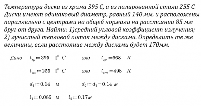 Температура диска из хрома 395⁰С, а из полированной стали 255⁰С. Диски имеют одинаковый диаметр, равный 140 мм, и расположены параллельно с центрами на общей нормали на расстоянии 85 мм друг от друга. Найти: 1)средний угловой коэффициент излучения; 2) лучистый тепловой поток между дисками. Определить те же величины, если расстояние между дисками будет 170мм.