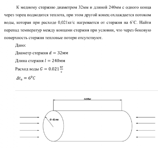 К медному стержню диаметром 32мм и длиной 240мм с одного конца через торец подводится теплота, при этом другой конец охлаждается потоком воды, которая при расходе 0,021кг/с нагревается от стержня на 6˚С. Найти перепад температур между концами стержня при условии, что через боковую поверхность стержня тепловые потери отсутствуют.