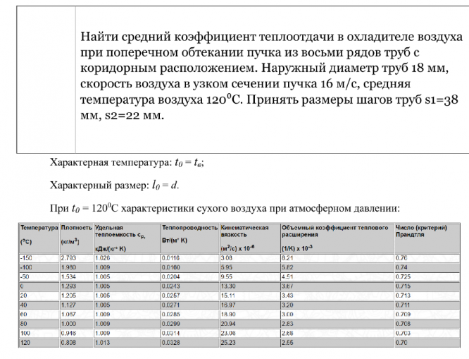 Найти средний коэффициент теплоотдачи в охладителе воздуха при поперечном обтекании пучка из восьми рядов труб с коридорным расположением. Наружный диаметр труб 18 мм, скорость воздуха в узком сечении пучка 16 м/с, средняя температура воздуха 120⁰С. Принять размеры шагов труб s1=38 мм, s2=22 мм.