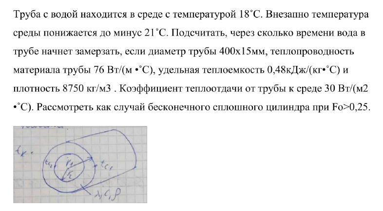 Труба с водой находится в среде с температурой 18˚С. Внезапно температура среды понижается до минус 21˚С. Подсчитать, через сколько времени вода в трубе начнет замерзать, если диаметр трубы 400х15мм, теплопроводность материала трубы 76 Вт/(м •˚С), удельная теплоемкость 0,48кДж/(кг•˚С) и плотность 8750 кг/м3 . Коэффициент теплоотдачи от трубы к среде 30 Вт/(м2 •˚С). Рассмотреть как случай бесконечного сплошного цилиндра при Fo>0,25.