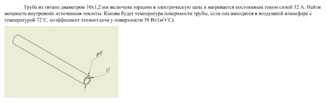 Труба из титана диаметром 10х1,2 мм включена торцами в электрическую цепь и нагревается постоянным током силой 32 А. Найти мощность внутренних источников теплоты. Какова будет температура поверхности трубы, если она находится в воздушной атмосфере с температурой 72˚С, коэффициент теплоотдачи у поверхности 38 Вт/(м2•˚С).