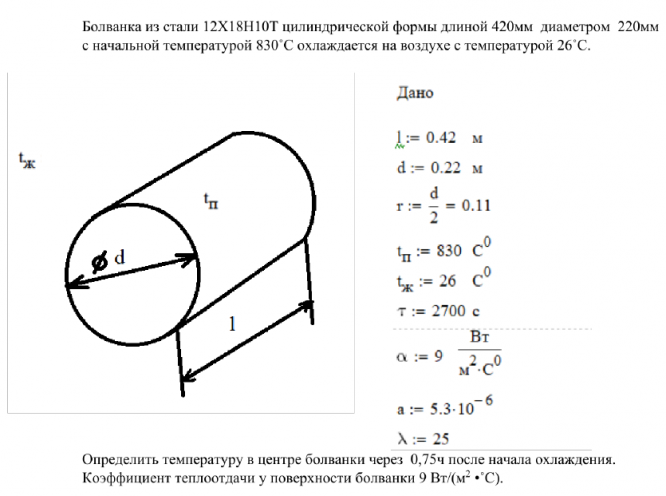 Болванка из стали 12Х18Н10Т цилиндрической формы длиной 420мм диаметром 220мм с начальной температурой 830˚С охлаждается на воздухе с температурой 26˚С. Определить температуру в центре болванки через 0,75ч после начала охлаждения.