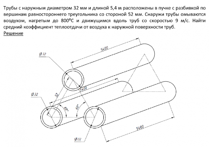 Трубы с наружным диаметром 32 мм и длиной 5,4 м расположены в пучке с разбивкой по вершинам равностороннего треугольника со стороной 52 мм. Снаружи трубы омываются воздухом, нагретым до 800⁰С и движущимся вдоль труб со скоростью 9 м/с. Найти средний коэффициент теплоотдачи от воздуха к наружной поверхности труб.