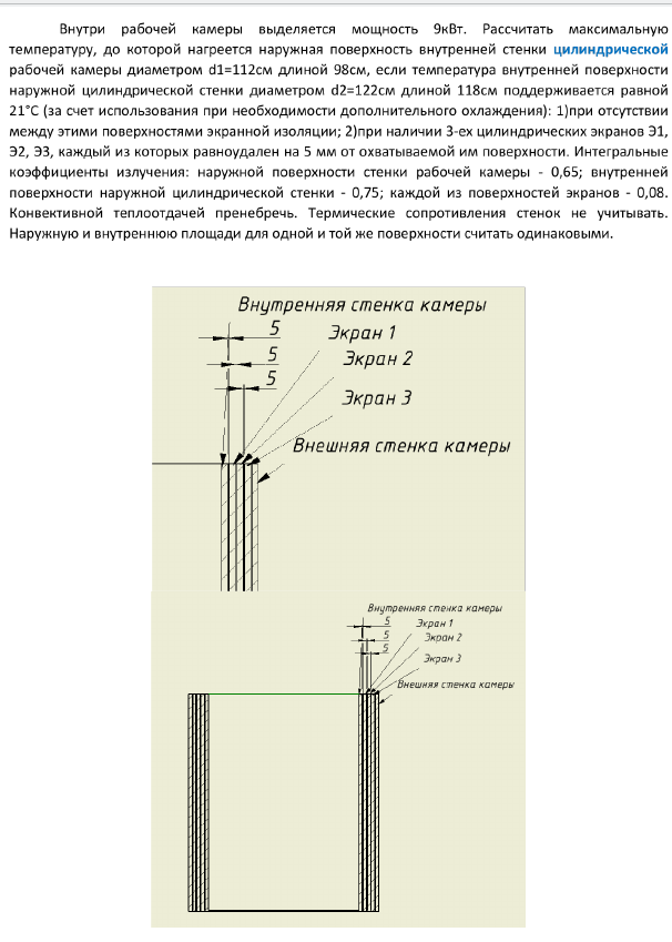 Внутри рабочей камеры выделяется мощность 9кВт. Рассчитать максимальную температуру, до которой нагреется наружная поверхность внутренней стенки цилиндрической рабочей камеры диаметром d1=112см длиной 98см, если температура внутренней поверхности наружной цилиндрической стенки диаметром d2=122см длиной 118см поддерживается равной 21°C (за счет использования при необходимости дополнительного охлаждения): 1)при отсутствии между этими поверхностями экранной изоляции; 2)при наличии 3-ех цилиндрических экранов Э1, Э2, Э3, каждый из которых равноудален на 5 мм от охватываемой им поверхности. Интегральные коэффициенты излучения: наружной поверхности стенки рабочей камеры - 0,65; внутренней поверхности наружной цилиндрической стенки - 0,75; каждой из поверхностей экранов - 0,08. Конвективной теплоотдачей пренебречь. Термические сопротивления стенок не учитывать. Наружную и внутреннюю площади для одной и той же поверхности считать одинаковыми.