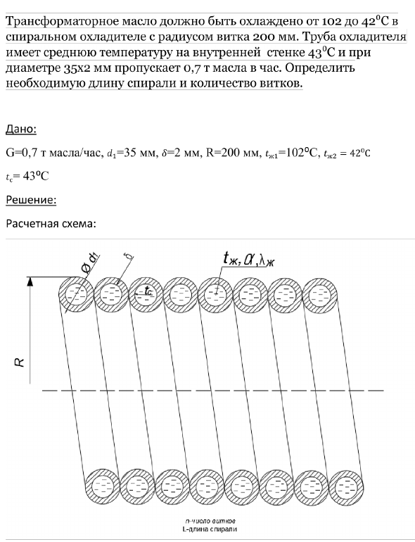 Трансформаторное масло должно быть охлаждено от 102 до 42⁰С в спиральном охладителе с радиусом витка 200 мм. Труба охладителя имеет среднюю температуру на внутренней стенке 43⁰С и при диаметре 35х2 мм пропускает 0,7 т масла в час. Определить необходимую длину спирали и количество витков.