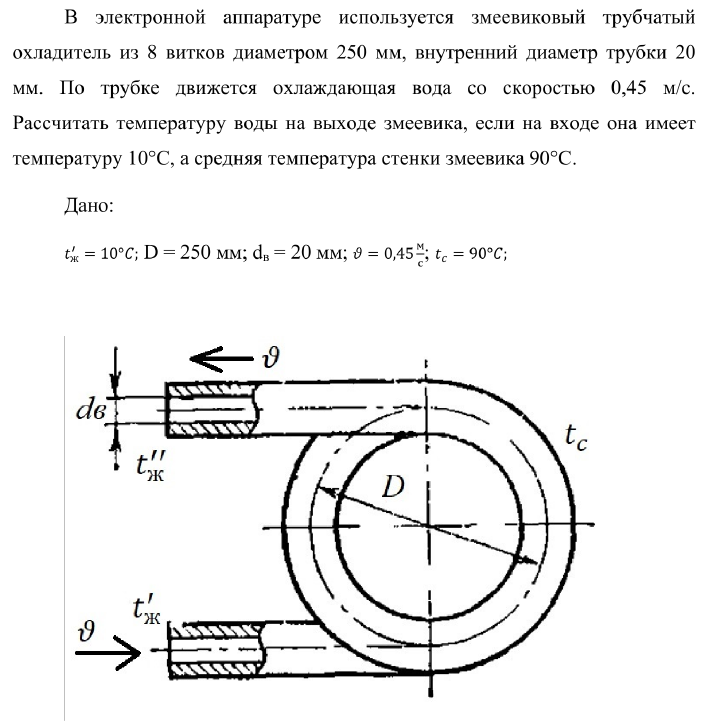 В электронной аппаратуре используется змеевиковый трубчатый охладитель из 8 витков диаметром 250 мм, внутренний диаметр трубки 20 мм. По трубке движется охлаждающая вода со скоростью 0,45 м/с. Рассчитать температуру воды на выходе из змеевика, если на входе она имеет температуру 10⁰С, а средняя температура стенки змеевика 90⁰С.