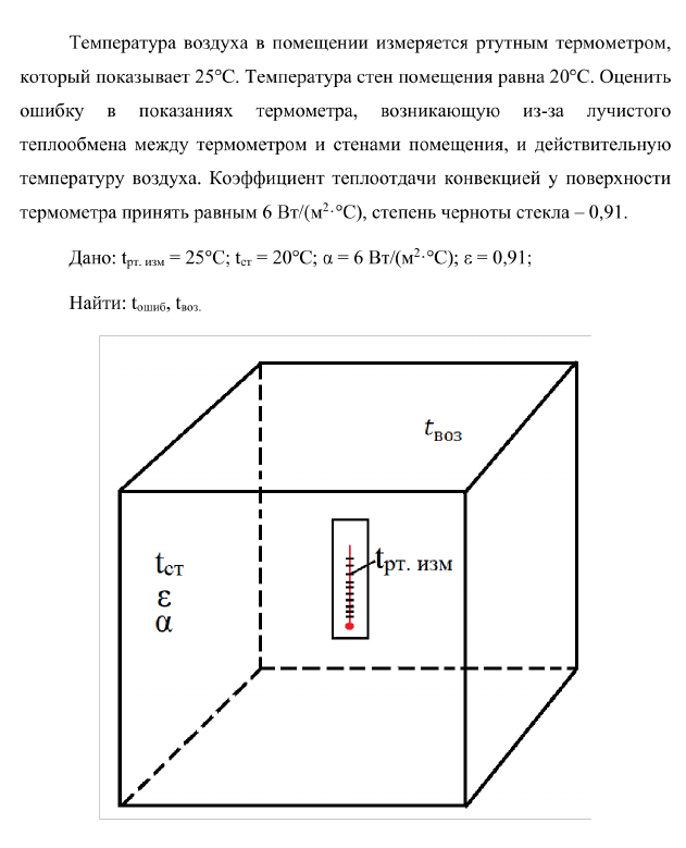 Температура воздуха в помещении измеряется ртутным термометром, который показывает 25 ⁰С. Температура стен помещения равна 20 ⁰С. Оценить ошибку в показаниях термометра, возникающую из-за лучистого теплообмена между термометром и стенами помещения, и действительную температуру воздуха. Коэффициент теплоотдачи конвекцией у поверхности термометра принять равным 6 Вт/(м2∙⁰С), степень черноты стекла – 0,91.