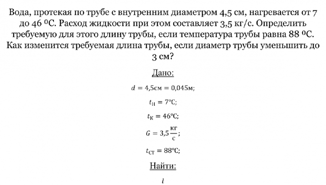 Вода, протекая по трубе с внутренним диаметром 4,5 см, нагревается от 7 до 46 ⁰С. Расход жидкости при этом составляет 3,5 кг/с. Определить требуемую для этого длину трубы, если температура трубы равна 88 ⁰С. Как изменится требуемая длина трубы, если диаметр трубы уменьшить до 3 см?