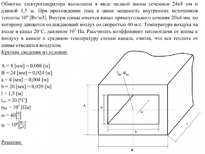 Обмотка электрогенератора выполнена в виде медной шины сечением 24х8 мм и длиной 1,5 м. При прохождении тока в шине мощность внутренних источников теплоты 106 [Вт/м3]. Внутри шины имеется канал прямоугольного сечения 20х4 мм, по которому движется охлаждающий воздух со скоростью 40 м/с. Температура воздуха на входе в канал 20⁰С, давление 105 Па. Рассчитать коэффициент теплоотдачи от шины к воздуху в канале и среднюю температуру стенки канала, считая, что вся теплота от шины отводится воздухом.