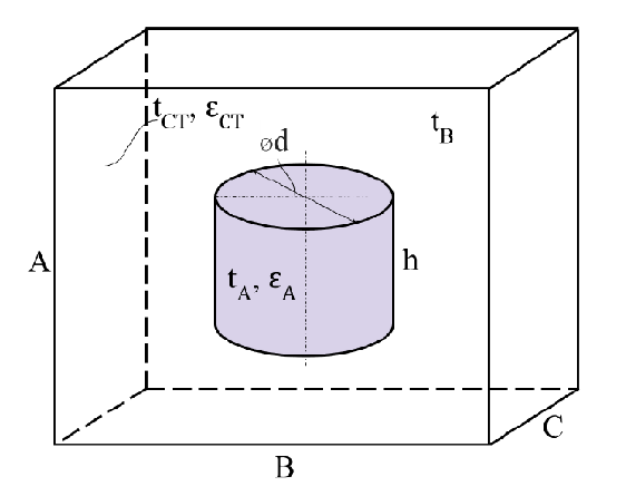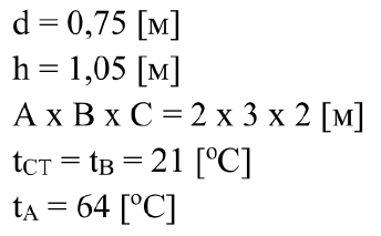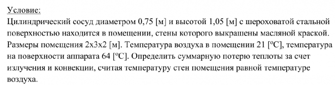 Цилиндрический сосуд диаметром 0,75 м и высотой 1,05 м с шероховатой стальной поверхностью находится в помещении, стены которого выкрашены масляной краской. Размеры помещения 2х3х2 м. Температура воздуха в помещении 21⁰С, температура на поверхности аппарата 64⁰С. Определить суммарную потерю теплоты за счет излучения и конвекции, считая температуру стен помещения равной температуре воздуха.
