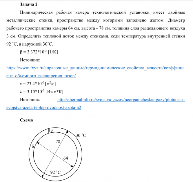 Цилиндрическая рабочая камера технологической установки имеет двойные металлические стенки, пространство между которыми заполнено азотом. Диаметр рабочего пространства камеры 64 см, высота - 78 см, толщина слоя разделяющего воздуха 3 см. Определить тепловой поток между стенками, если температура внутренней стенки 92 ˚С, а наружной 30˚С.