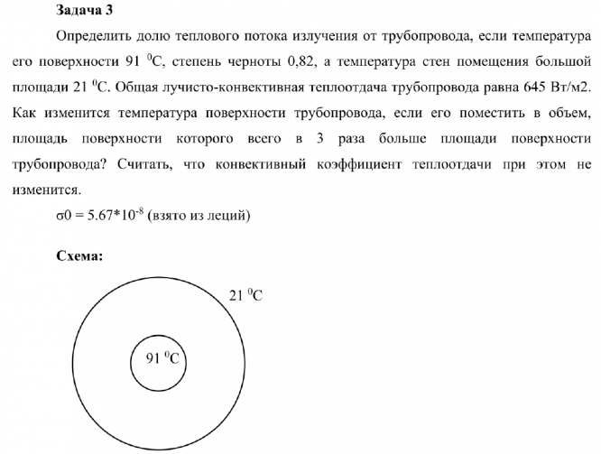Определить долю теплового потока излучения от трубопровода, если температура его поверхности 91 0С, степень черноты 0,82, а температура стен помещения большой площади 21 0С. Общая лучисто-конвективная теплоотдача трубопровода равна 645 Вт/м2. Как изменится температура поверхности трубопровода, если его поместить в объем, площадь поверхности которого всего в 3 раза больше площади поверхности трубопровода? Считать, что конвективный коэффициент теплоотдачи при этом не изменится.