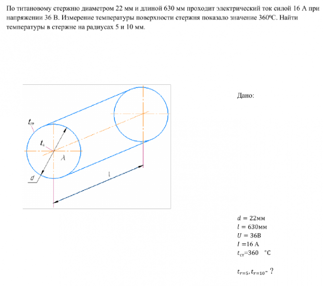 По титановому стержню диаметром 22 мм и длиной 630 мм проходит электрический ток силой 16 А при напряжении 36 В. Измерение температуры поверхности стержня показало значение 360⁰С. Найти температуры в стержне на радиусах 5 и 10 мм.