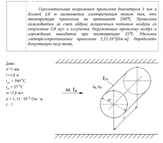 Горизонтальная нихромовая проволока диаметром 1 мм и длиной 1,8 м нагревается электрическим током так, что температура проволоки не превышает 590⁰С. Проволока охлаждается за счет обдува поперечным потоком воздуха со скоростью 2,8 м/с и излучения. Окружающие проволоку воздух и ограждения находятся при температуре 25⁰С. Удельное электросопротивление проволоки 1,11∙10-6[Ом∙м]. Определить допустимую силу тока..