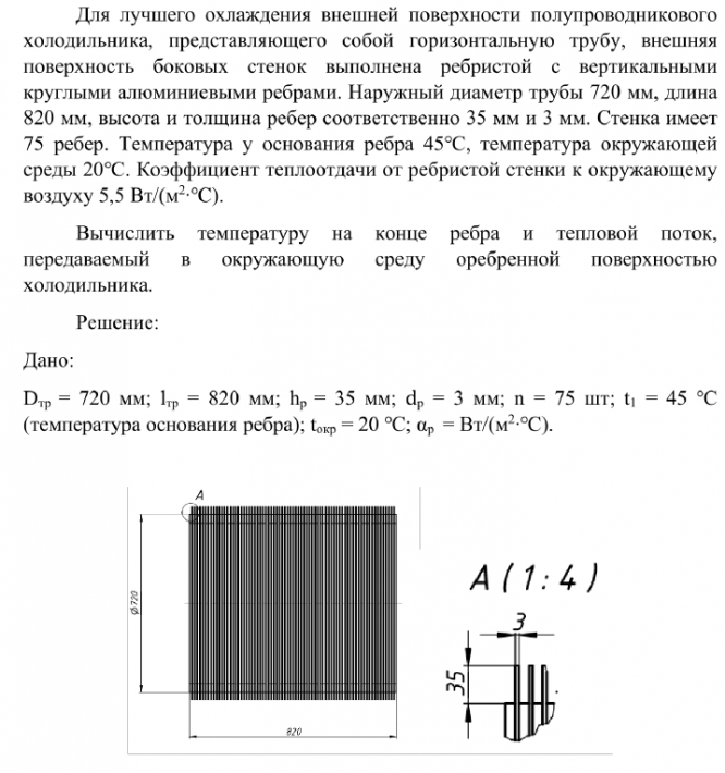 Для лучшего охлаждения внешней поверхности полупроводникового холодильника, представляющего собой горизонтальную трубу, внешняя поверхность боковых стенок выполнена ребристой с вертикальными круглыми алюминиевыми ребрами. Наружный диаметр трубы 720 мм, длина 820 мм, высота и толщина ребер соответственно 35 мм и 3 мм. Стенка имеет 75 ребер. Температура у основания ребра 45℃, температура окружающей среды 20℃. Коэффициент теплоотдачи от ребристой стенки к окружающему воздуху 5,5 Вт/(м2∙℃).