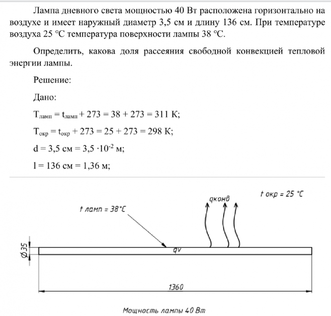 Лампа дневного света мощностью 40 Вт расположена горизонтально на воздухе и имеет наружный диаметр 3,5 см и длину 136 см. При температуре воздуха 25 ℃ температура поверхности лампы 38 ℃.