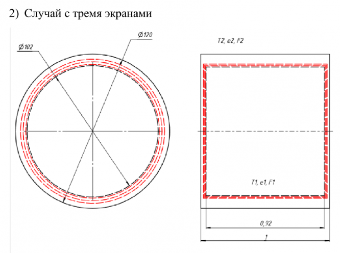 Интегральные коэффициенты излучения: наружной поверхности стенки рабочей камеры – 0, 44; внутренней поверхности наружной цилиндрической стенки – 0, 64; каждый из поверхностей экранов – 0,07. Конвективной теплоотдачей пренебречь. Термические сопротивления стенок не учитывать. Наружную и внутреннюю площади для одной и той же поверхности считать одинаковыми.