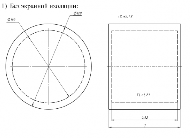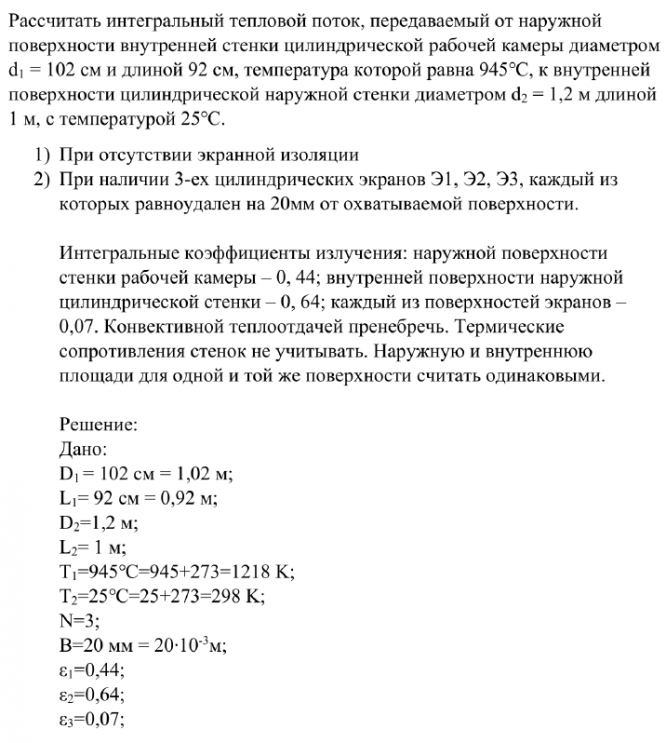 Рассчитать интегральный тепловой поток, передаваемый от наружной поверхности внутренней стенки цилиндрической рабочей камеры диаметром d1 = 102 см и длиной 92 см, температура которой равна 945℃, к внутренней поверхности цилиндрической наружной стенки диаметром d2 = 1,2 м длиной 1 м, с температурой 25℃.