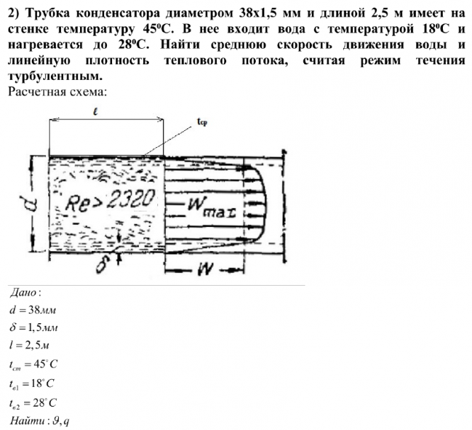 Трубка конденсатора диаметром 38х1,5 мм и длиной 2,5 м имеет на стенке температуру 45⁰С. В нее входит вода с температурой 18⁰С и нагревается до 28⁰С. Найти среднюю скорость движения воды и линейную плотность теплового потока, считая режим течения турбулентным.