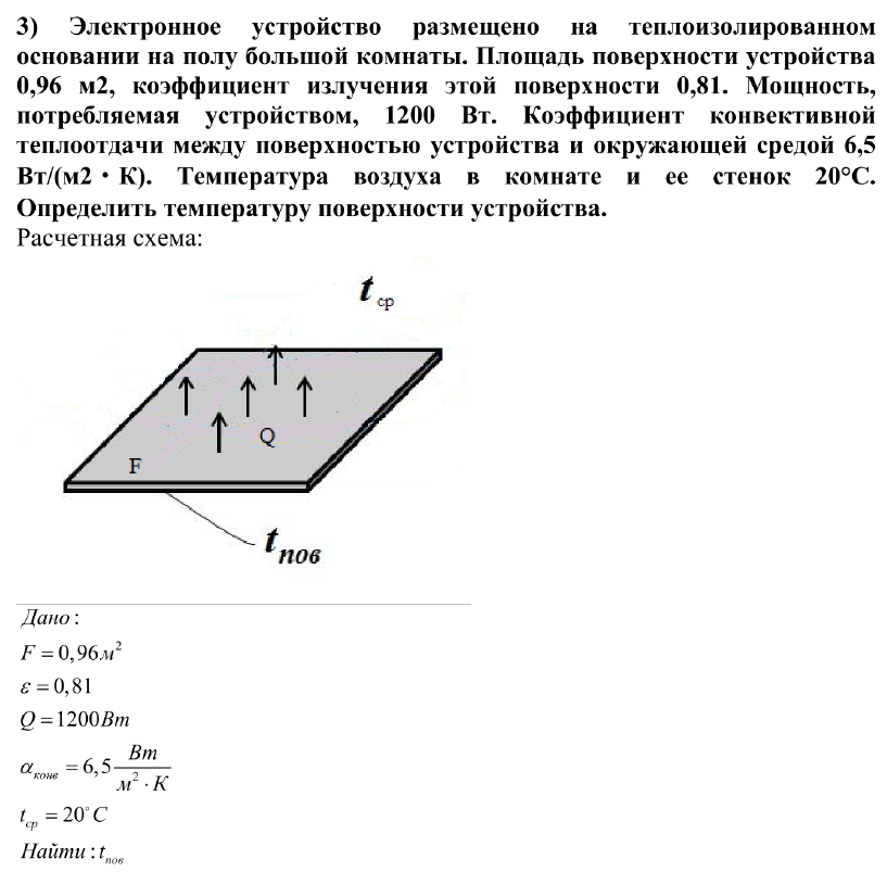 Электронное устройство размещено на теплоизолированном основании на полу большой комнаты. Площадь поверхности устройства 0,96 м2, коэффициент излучения этой поверхности 0,81. Мощность, потребляемая устройством, 1200 Вт. Коэффициент конвективной теплоотдачи между поверхностью устройства и окружающей средой 6,5 Вт/(м2・К). Температура воздуха в комнате и ее стенок 20°C. Определить температуру поверхности устройства.