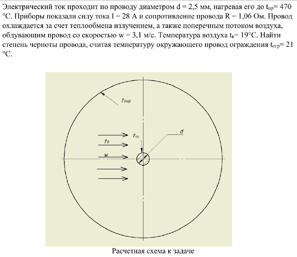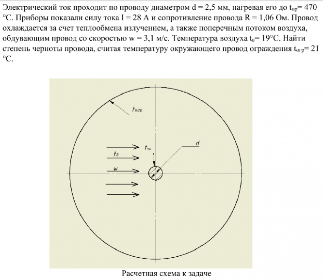 Электрический ток проходит по проводу диаметром d = 2,5 мм, нагревая его до tпр= 470 °C. Приборы показали силу тока I = 28 А и сопротивление провода R = 1,06 Ом. Провод охлаждается за счет теплообмена излучением, а также поперечным потоком воздуха, обдувающим провод со скоростью w = 3,1 м/с. Температура воздуха tв= 19°C. Найти степень черноты провода, считая температуру окружающего провод ограждения tогр= 21 °C.