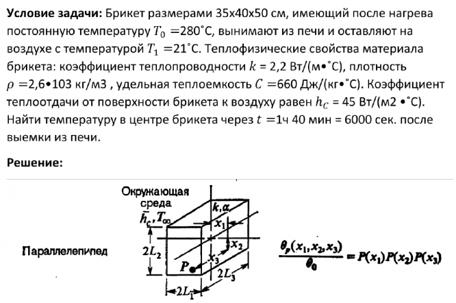 Брикет размерами 35х40х50 см, имеющий после нагрева постоянную температуру 280˚С, вынимают из печи и оставляют на воздухе с температурой 21˚С. Теплофизические свойства материала брикета: коэффициент теплопроводности 2,2 Вт/(м•˚С), плотность 2,6•103кг/м3, удельная теплоемкость 660 Дж/(кг•˚С). Коэффициент теплоотдачи от поверхности брикета к воздуху равен 45 Вт/(м2•˚С). Найти температуру в центре брикета через 1ч 40мин после выемки из печи.