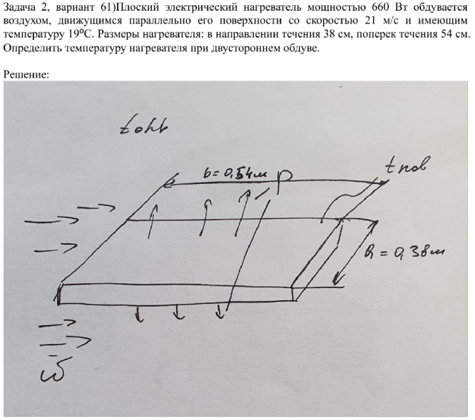 Плоский электрический нагреватель мощностью 660 Вт обдувается воздухом, движущимся параллельно его поверхности со скоростью 21 м/с и имеющим температуру 19⁰С. Размеры нагревателя: в направлении течения 38 см, поперек течения 54 см. Определить температуру нагревателя при двустороннем обдуве.