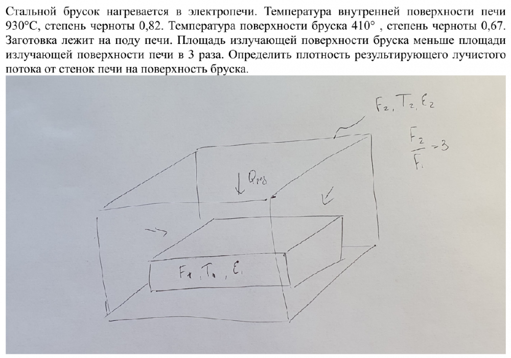 Стальной брусок нагревается в электропечи. Температура внутренней поверхности печи 930°C, степень черноты 0,82. Температура поверхности бруска 410° , степень черноты 0,67. Заготовка лежит на поду печи. Площадь излучающей поверхности бруска меньше площади излучающей поверхности печи в 3 раза. Определить плотность результирующего лучистого потока от стенок печи на поверхность бруска.