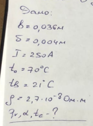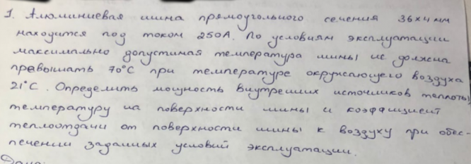 Алюминиевая шина прямоугольного сечения 36х4 мм находится под током 250 А. По условиям эксплуатации максимально допустимая температура шины не должна превышать 70⁰С при температуре окружающего воздуха 21⁰С. Определить мощность внутренних источников теплоты, температуру на поверхности шины и коэффициент теплоотдачи от поверхности шины к воздуху при обеспечении заданных условий эксплуатации.