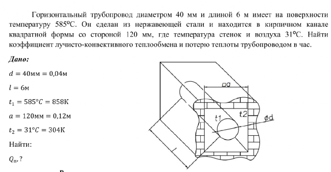 Горизонтальный трубопровод диаметром 40 мм и длиной 6 м имеет на поверхности температуру 585⁰С. Он сделан из нержавеющей стали и находится в кирпичном канале квадратной формы со стороной 120 мм, где температура стенок и воздуха 31⁰С. Найти коэффициент лучисто-конвективного теплообмена и потерю теплоты трубопроводом в час.