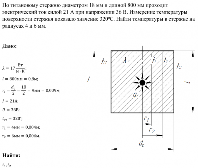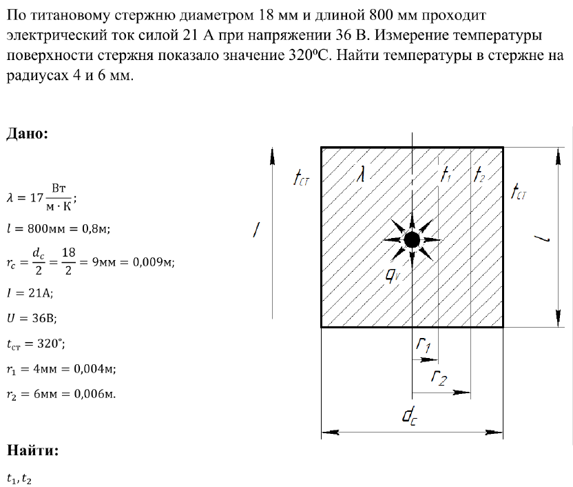 По титановому стержню диаметром 18 мм и длиной 800 мм проходит электрический ток силой 21 А при напряжении 36 В. Измерение температуры поверхности стержня показало значение 320⁰С. Найти температуры в стержне на радиусах 4 и 6 мм.