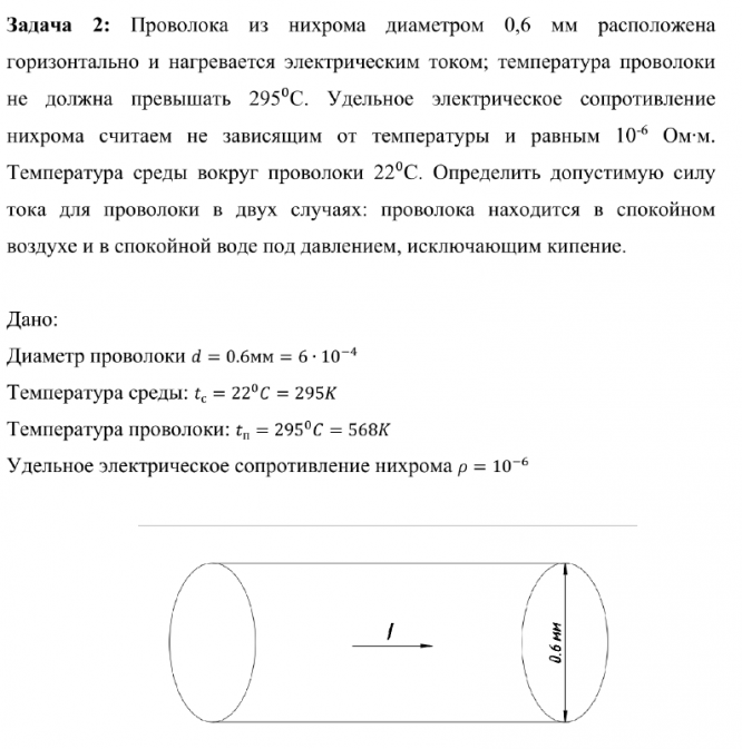 Проволока из нихрома диаметром 0,6 мм расположена горизонтально и нагревается электрическим током; температура проволоки не должна превышать 295⁰С. Удельное электрическое сопротивление нихрома считаем не зависящим от температуры и равным 10-6 Ом∙м. Температура среды вокруг проволоки 22⁰С. Определить допустимую силу тока для проволоки в двух случаях: проволока находится в спокойном воздухе и в спокойной воде под давлением, исключающим кипение.