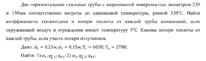 Две горизонтальные стальные трубы с шероховатой поверхностью диаметром 230 и 150 мм соответственно нагреты до одинаковой температуры, равной 330⁰С. Найти коэффициенты теплоотдачи и потери теплоты от каждой трубы конвекцией, если окружающий воздух и ограждения имеют температуру 5⁰С.Каковы потери теплоты от каждой трубы, если учесть и потери излучением?