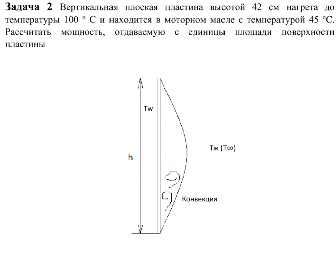 Вертикальная плоская пластина высотой 42 см нагрета до температуры 100 o С и находится в моторном масле с температурой 45 oС. Рассчитать мощность, отдаваемую с единицы площади поверхности пластины