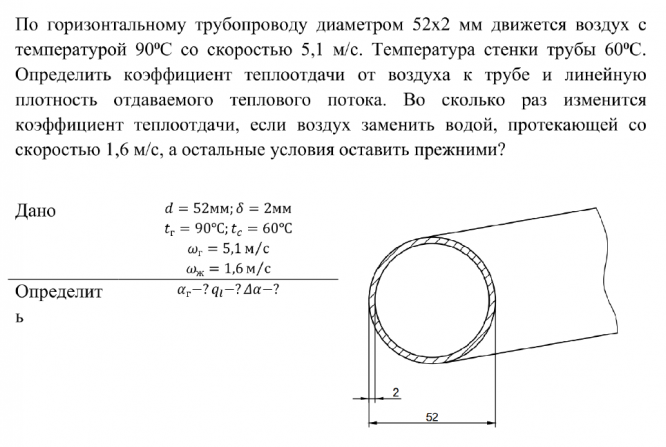 По горизонтальному трубопроводу диаметром 52х2 мм движется воздух с температурой 90⁰С со скоростью 5,1 м/с. Температура стенки трубы 60⁰С. Определить коэффициент теплоотдачи от воздуха к трубе и линейную плотность отдаваемого теплового потока. Во сколько раз изменится коэффициент теплоотдачи, если воздух заменить водой, протекающей со скоростью 1,6 м/с, а остальные условия оставить прежними?