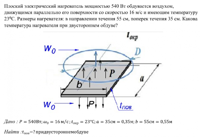 Плоский электрический нагреватель мощностью 540 Вт обдувается воздухом, движущимся параллельно его поверхности со скоростью 16 м/с и имеющим температуру 23⁰С. Размеры нагревателя: в направлении течения 55 см, поперек течения 35 см. Какова температура нагревателя при двустороннем обдуве?