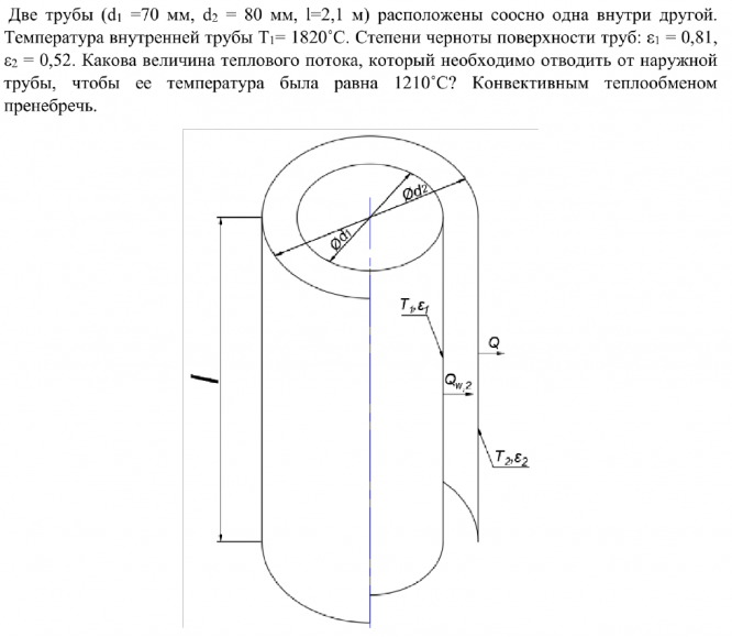 Две трубы (d1 =70 мм, d2 = 80 мм, l=2,1 м) расположены соосно одна внутри другой. Температура внутренней трубы Т1= 1820˚C. Степени черноты поверхности труб: ε1 = 0,81, ε2 = 0,52. Какова величина теплового потока, который необходимо отводить от наружной трубы, чтобы ее температура была равна 1210˚C? Конвективным теплообменом пренебречь.