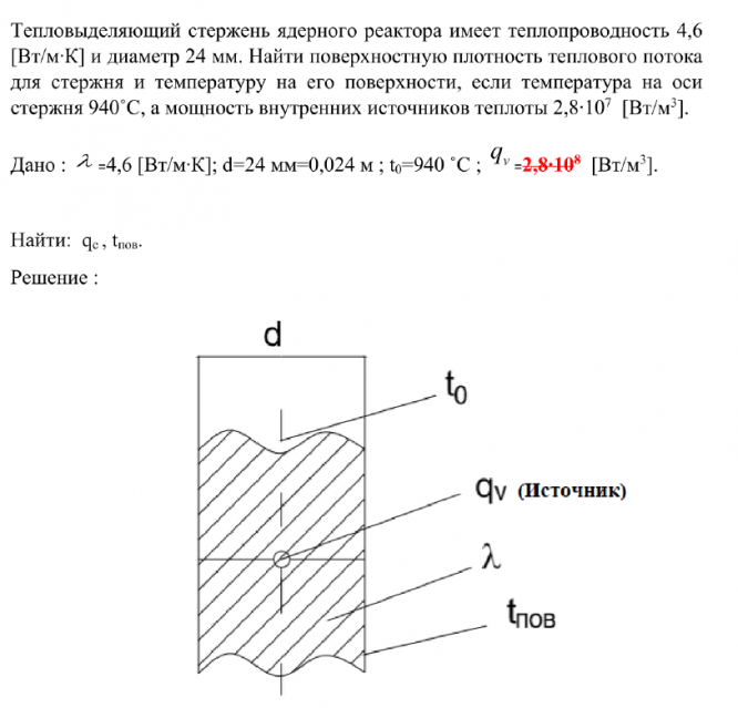Тепловыделяющий стержень ядерного реактора имеет теплопроводность 4,6 [Вт/м∙К] и диаметр 24 мм. Найти поверхностную плотность теплового потока для стержня и температуру на его поверхности, если температура на оси стержня 940˚С, а мощность внутренних источников теплоты 2,8∙107 [Вт/м3].