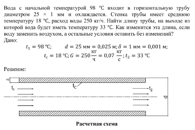 Вода с начальной температурой 98⁰С входит в горизонтальную трубу диаметром 25х1 мм и охлаждается. Стенка трубы имеет среднюю температуру 18⁰С, расход воды 250 кг/ч. Найти длину трубы, на выходе из которой вода будет иметь температуру 33⁰С. Как изменится эта длина, если воду заменить воздухом, а остальные условия оставить без изменения?