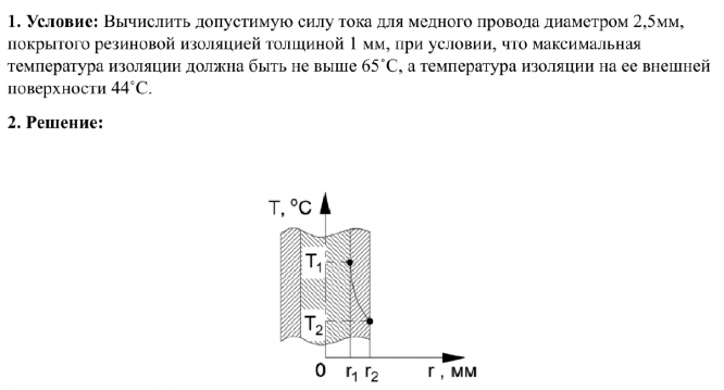 Вычислить допустимую силу тока для медного провода диаметром 2,5мм, покрытого резиновой изоляцией толщиной 1 мм, при условии, что максимальная температура изоляции должна быть не выше 65˚С, а температура изоляции на ее внешней поверхности 44˚С.