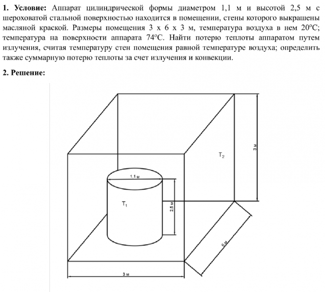 Аппарат цилиндрической формы диаметром 1,1 м и высотой 2,5 м с шероховатой стальной поверхностью находится в помещении, стены которого выкрашены масляной краской. Размеры помещения 3 х 6 х 3 м, температура воздуха в нем 20oС; температура на поверхности аппарата 74oС. Найти потерю теплоты аппаратом путем излучения, считая температуру стен помещения равной температуре воздуха; определить также суммарную потерю теплоты за счет излучения и конвекции.