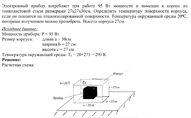Электронный прибор потребляет при работе 95 Вт мощности и помещен в корпус из тонколистовой стали размерами 27х27х30см. Определить температуру поверхности корпуса, если он покоится на теплоизолированной поверхности. Температура окружающей среды 20⁰С, потерями излучением можно пренебречь. Высота корпуса 27см.