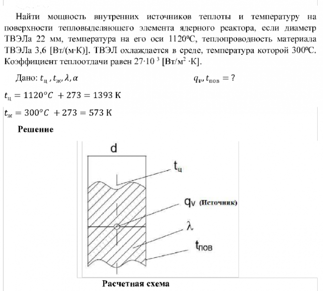 Найти мощность внутренних источников теплоты и температуру на поверхности тепловыделяющего элемента ядерного реактора, если диаметр ТВЭЛа 22 мм, температура на его оси 1120⁰С, теплопроводность материала ТВЭЛа 3,6 [Вт/(м∙К)]. ТВЭЛ охлаждается в среде, температура которой 300⁰С. Коэффициент теплоотдачи равен 27∙103 [Вт/м2∙К].