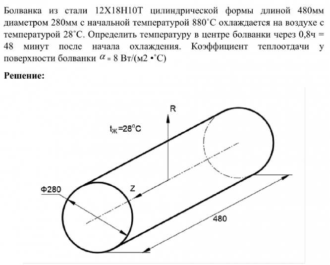 Болванка из стали 12Х18Н10Т цилиндрической формы длиной 480мм диаметром 280мм с начальной температурой 880˚С охлаждается на воздухе с температурой 28˚С. Определить температуру в центре болванки через 0,8ч после начала охлаждения. Коэффициент теплоотдачи у поверхности болванки 8 Вт/(м2 •˚С).