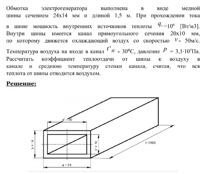 Обмотка электрогенератора выполнена в виде медной шины сечением 24х14 мм и длиной 1,5 м. При прохождении тока в шине мощность внутренних источников теплоты 106 [Вт/м3]. Внутри шины имеется канал прямоугольного сечения 20х10 мм, по которому движется охлаждающий воздух со скоростью 50 м/с. Температура воздуха на входе в канал 30⁰С, давление 3,1∙105 Па. Рассчитать коэффициент теплоотдачи от шины к воздуху в канале и среднюю температуру стенки канала, считая, что вся теплота от шины отводится воздухом.