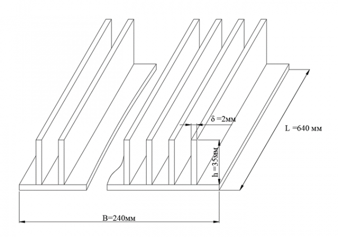 Задача 1 вариант 19. На плоской алюминиевой стенке холодильной камеры размером 640х240 мм расположено 36 ребер толщиной 2,0 мм и высотой 35 мм.