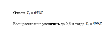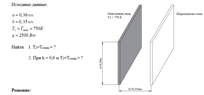 На расстоянии 0,35 м друг от друга расположены параллельно две полосы одинаковой ширины(по 360 мм). Более нагретая полоса из окисленной меди имеет температуру 750 К и передает 2500 Вт излучением с 1 м2 ­поверхности на вторую полосу, изготовленную из шероховатой стали. Определить температуру поверхности стальной полосы.Чему равна эта температура, если расстояние увеличить до 0,6 м?